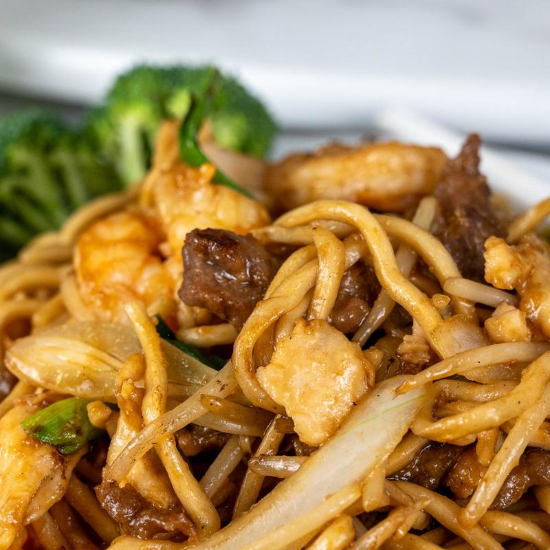 Tender beef, stir-fried with vegetables and served over lo mein noodles.